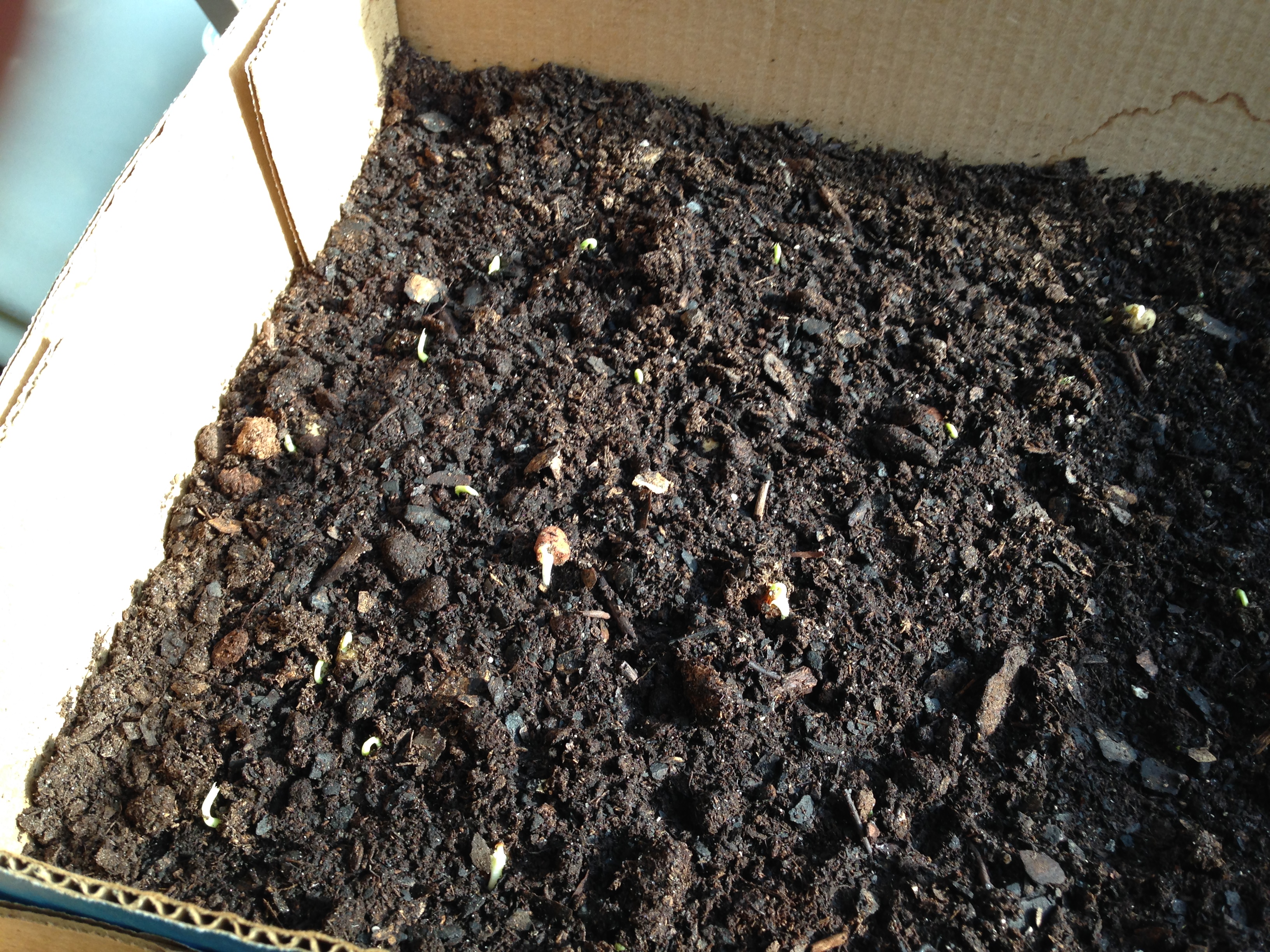 Posted on March 17, 2015 by admingermination! Wow! Three days ago I planted seeds. Since then, everything has emerged except for the herbs (rosemary and basil). Very exciting! The most advanced are the peas. Here’s the evidence: