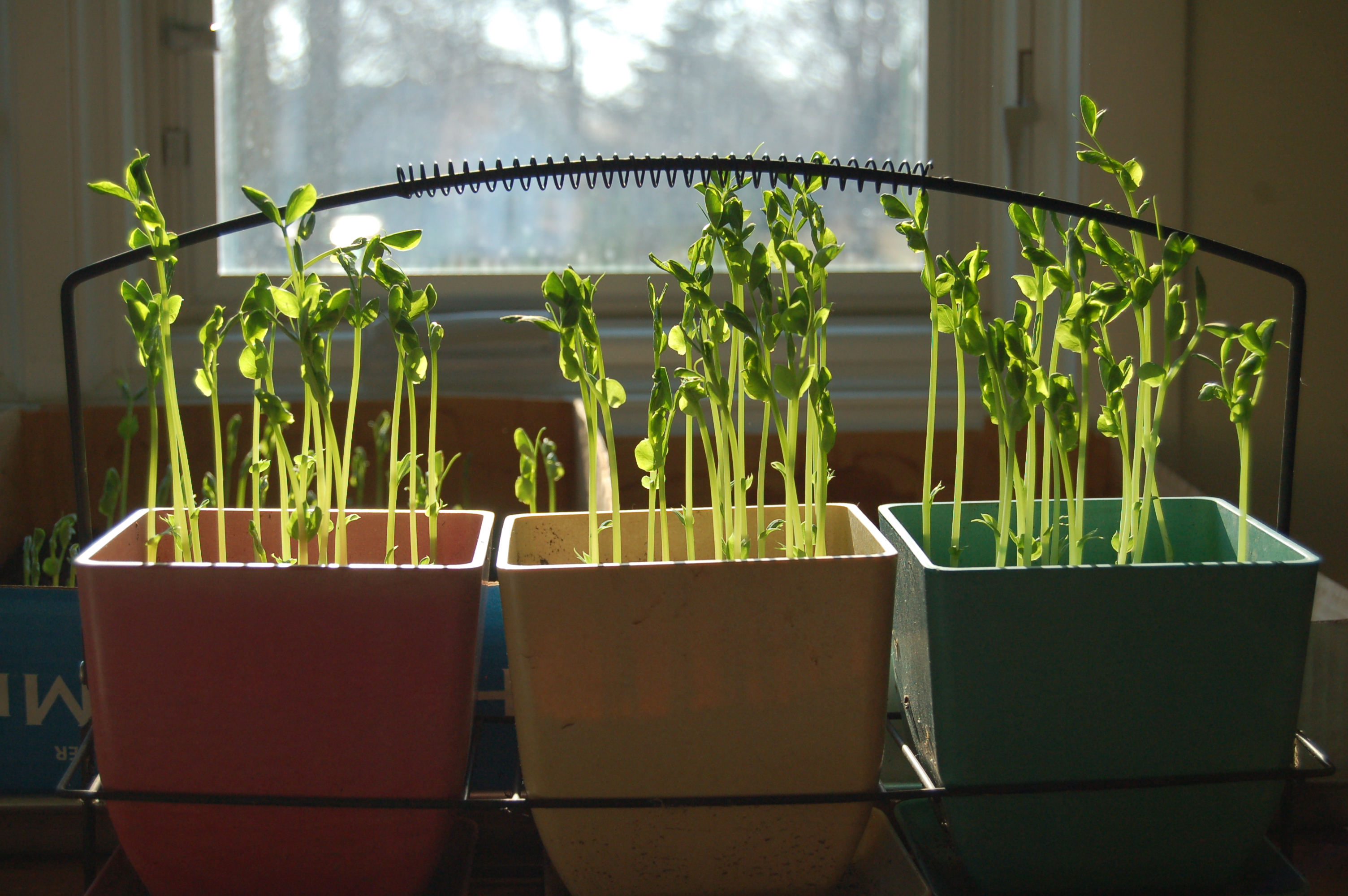 Here is what happens when I leave town for 36 hours. Mom and I went to visit Grandma yesterday. When I arrived home, the peas had shot up another two inches–NOT an exaggeration! Â We need to hurry up and get a place for these; otherwise . . . Here’s what the crop looked like: